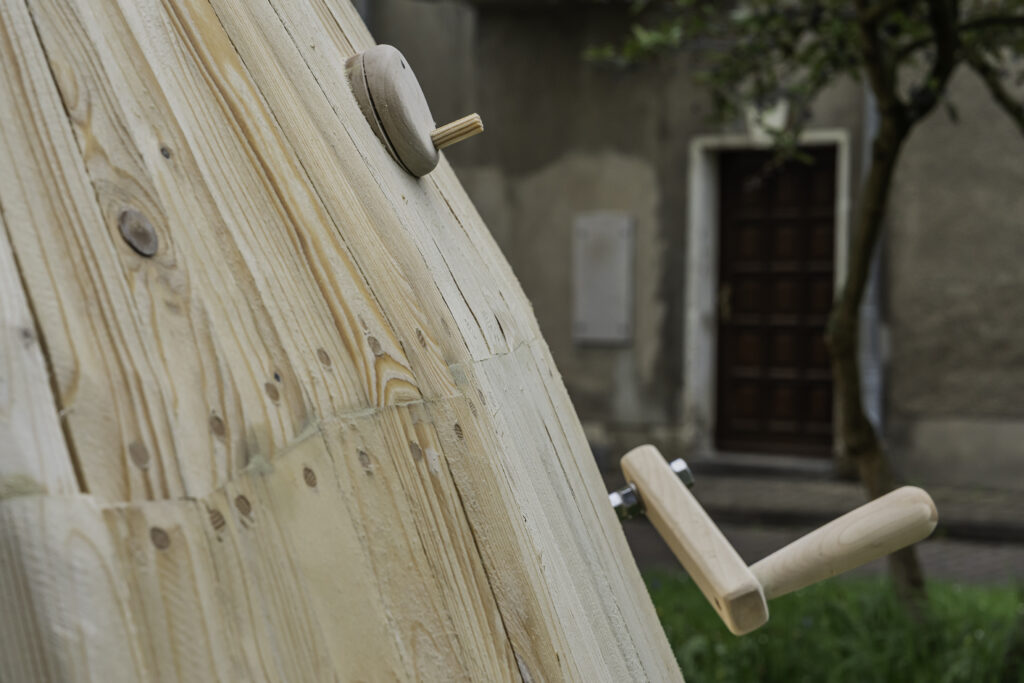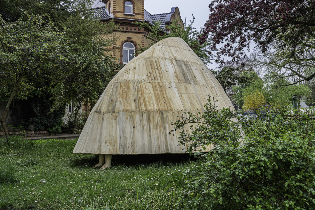 Die Künstlerin sagt: „Die Abraumhalden in der Region sind wie Landmarken. Meine Holzhalden erinnern auch an die politischen und wirtschaftlichen Veränderungen, die dem Landstrich passiert sind.“ Die Besonderheit ihres Kunstwerkes: Im Inneren befindet sich ein Megaphon, in das die Besucherinnen und Besucher sprechen können. Da der Lautsprecher des Megaphons nach innen gerichtet ist, bleibt das Geräusch in der Form und wird gedämpft. Der Ton wird verschluckt und verfremdet.