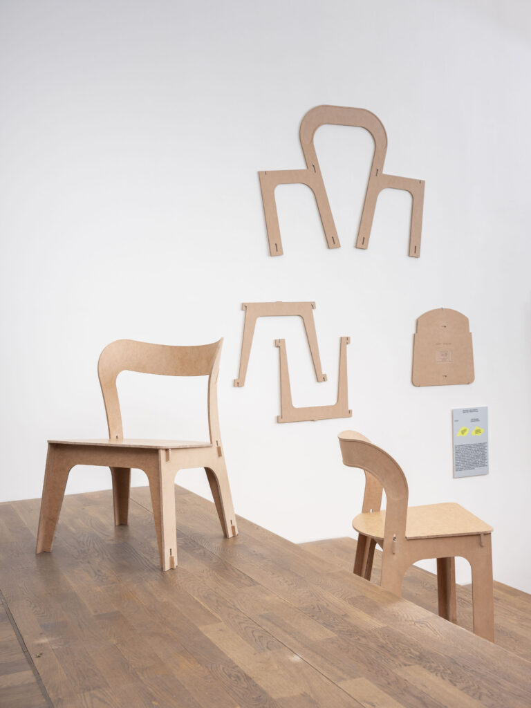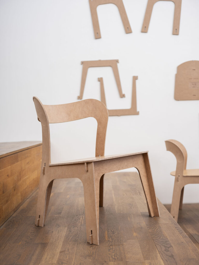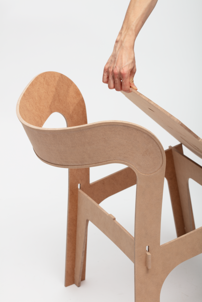Man kann damit großartige Möbel entwickeln, bauen und zusammenstecken. Mich hat es bei der Entwicklung sehr gefreut, eine Lösung zu finden, die auch mit einem leichten Augenzwinkern verbunden ist. Im Ernst, die Biegung mit Wasser ist ja zunächst ein wenig abwegig und lustig, aber trotzdem funktioniert es und sieht wirklich gut aus. Es ermöglicht, viele Formen selbst zu entwickeln. Zudem hat es viele logistische Vorteile. Die Bestandteile der Möbelstücke können gut gelagert werden. Sie sind leicht transportierbar und können als „Flat Pack“, also im flachen Zustand, geliefert werden. Zudem kann man sie gut zusammenbauen. Es braucht nur wenige Arbeitsschritte, die eigentlich jeder einfach verstehen kann. Trotz dieser Einfachheut gibt es eine große Vielfalt an unterschiedlichen Anwendungsbeispielen.