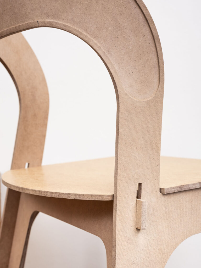 Das Design und der vorrausgehende Entwurf waren für mich ganz essentiell. Von Anfang an wollte ich, dass das Design minimalistisch und vor allem einfach ist. Dahin mit dem Endprodukt zu kommen, war ein sehr langwieriger Prozess. Ich habe mich am längsten mit dem Design beschäftigt. Das Material, dessen Verhalten und dessen Eigenschaften, waren ab einem bestimmten Punkt klar. Das Design hat sich daraus entwickelt. Wie vorhin erläutert, wollte ich gern offensichtliche Steckverbindungen schaffen und zugleich einen schönen Stuhl entwickeln, den man auch gern Zuhause hat, den man gern betrachtet und der zugleich funktional aber auch ein ästhetisch anspruchsvolles Objekt ist. Zudem wollte ich bei der Möbelserie ein Grundkonzept zugrunde legen, das immer wieder erweitert und fortgeführt werden kann.
