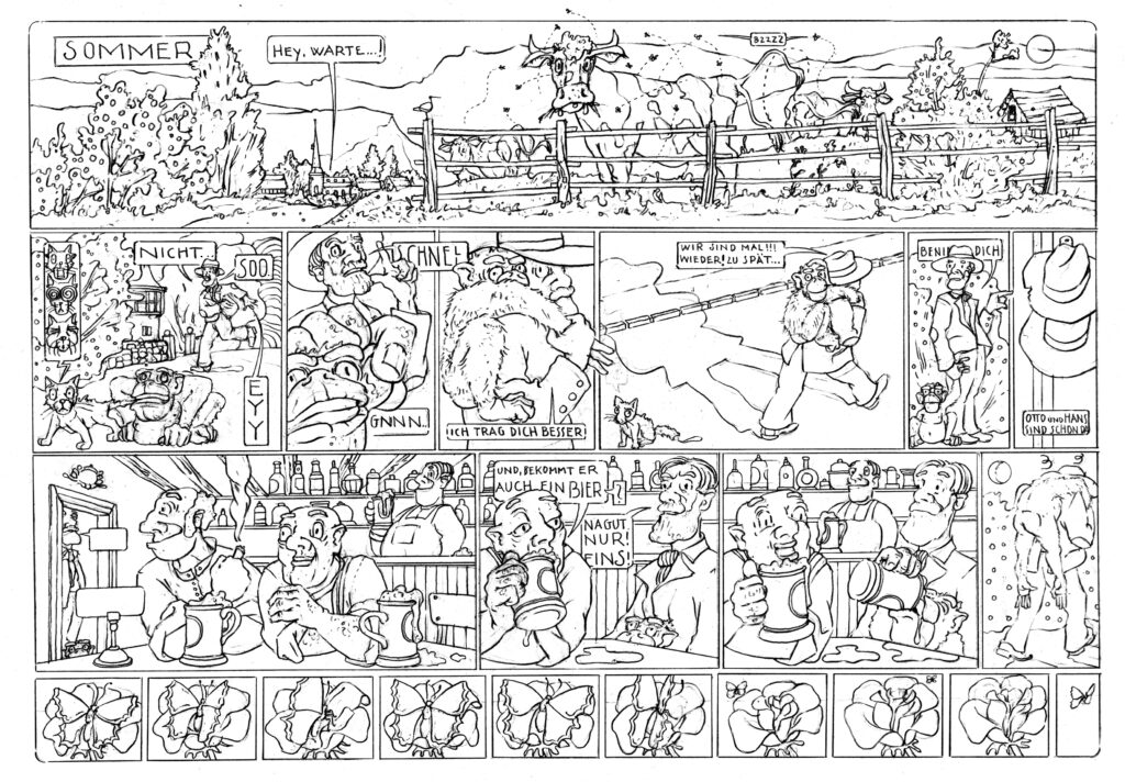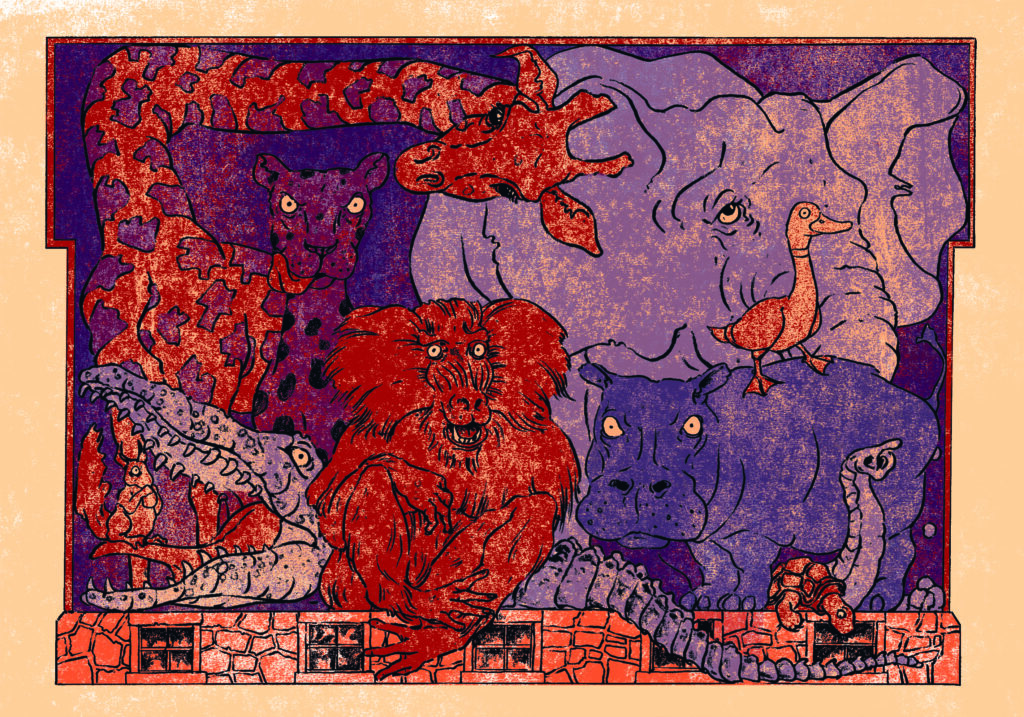 Tiere im Brehmhaus, 2024, kolorierte Zeichnung