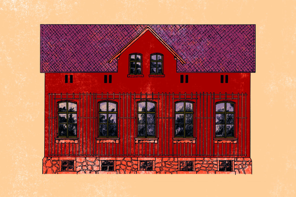 Vorderfront des Brehmhauses, 2024, kolorierte Zeichnung