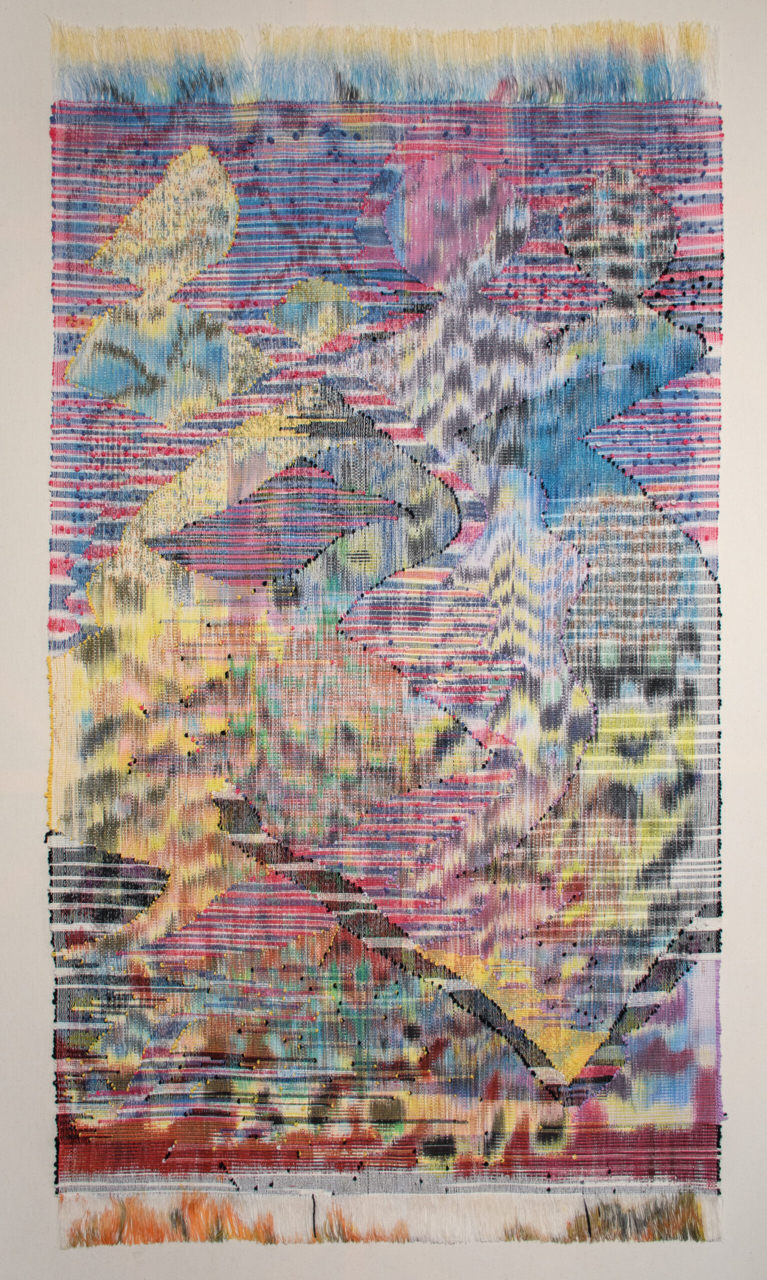 Die Webkette wurde auf dem Atelierboden ausgelegt, gespannt und mit Textilfarben bemalt. Die später einzuwebenden Schussgarne wurden ebenfalls bündelweise bemalt und/oder in Farbe getaucht, um partielle und mehrfarbige Einfärbungen zu erzeugen. Nach der Bemalung wurde die Webkette auf den Kettbaum gewickelt, der dann in den Webstuhl eingehängt wurde. Im Webstuhl wird die Webkette unter Spannung wieder vom Kettbaum abgewickelt, sozusagen durch den Webstuhl „gezogen“ und auf der gegenüberliegenden Seite des Webstuhls durch den Eintrag der Schussgarne zu einem Gewebe verwebt. Im Webstuhl ist immer nur ein begrenzter Teil der Webkette und somit des zukünftigen Formats/Motivs sichtbar, insgesamt ca. 100 cm (davon 60 cm unverwebt und 40 cm verwebt). Der Rest ist noch auf dem Kettbaum aufgewickelt oder nach der Eintragung der Schüsse, also dem Prozess des Verwebens, ebenfalls wieder aufgewickelt, diesmal auf dem Warenbaum. Beide Partien sind nicht einsehbar, ohne die gespannte Kette zu lösen und das Gewebe abzuwickeln bzw. herauszuziehen. Während des Webens geht das nur bedingt, sodass kein Überblick über die gesamte zu bearbeitende Bildfläche möglich ist wie etwa der Maler beim Bearbeiten einer Leinwand. Deshalb macht Andreas Köppe und Katharina Stark viele Fotos während des Webens, um sich an die verschwindenden Bildbereiche zu erinnern und auf das Hergestellte zu reagieren. Reizvoll war für sie aber auch, nicht alles überblicken zu können. Spontanität und Freiheit in der Umsetzung sind ihnen wichtig. Deshalb wurde auch die bereits bemalte und in den Webstuhl gespannte Webkette weiterbemalt und unmittelbar darauf verwebt. Auch die farbigen Schussgarne ermöglichten es, den Bildeindruck und die Stofflichkeit / die Materialität des Gewebes zu beeinflussen.