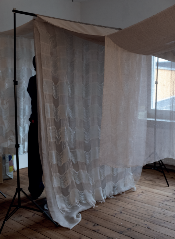 Um die vielschichtige Geschichte erahnen zu lassen, schuf Johanna Rogalla eine textile Installation. Um bei den Geweben Räumlichkeit zu erzeugen, wurden in einem mehrlagigen Jacquardgewebe Kunst- und Naturseide zu einem halbtransparenten Karomuster kombiniert. Durch gezielte Einschnitte in einzelne Lagen des Gewebes entsteht Räumlichkeit und im Inneren verborgene Schichten werden durch Auffalten sichtbar. Bei der Installation werden die Stoffe so aufgehangen, dass die Besucherinnen in sie hineingehen können, um möglichst viele Blickwinkel und unterschiedlich miteinander verwobene Qualitäten erfahren zu können. Durch die Mehrlagigkeit und die unterschiedlichen Garnqualitäten entstehen optische Moiré-Effekte. Je nach Lichtsituation ändern sich auch der Glanz der Kunstseide oder das Schattenspiel des großflächigen Karomusters. Die Installation verwebt die Geschichten von unterschiedlichen Orten und Zeiten der Textilproduktion und lässt Raum für eigene Interpretationen und ästhetische Wahrnehmung.