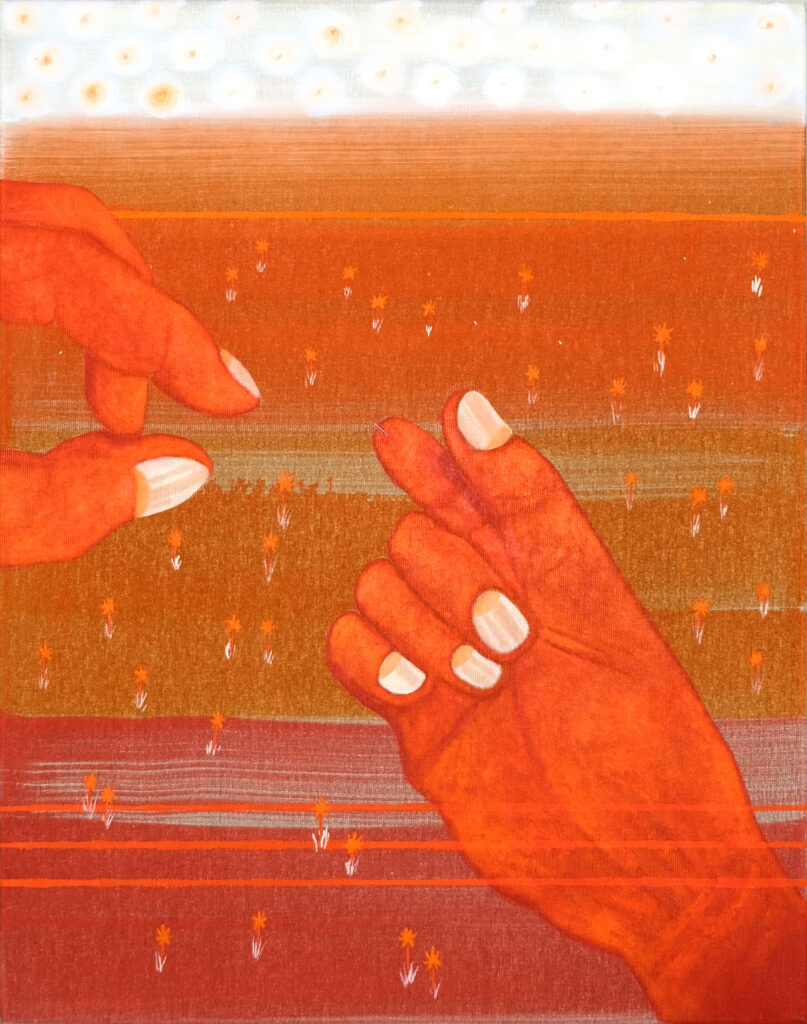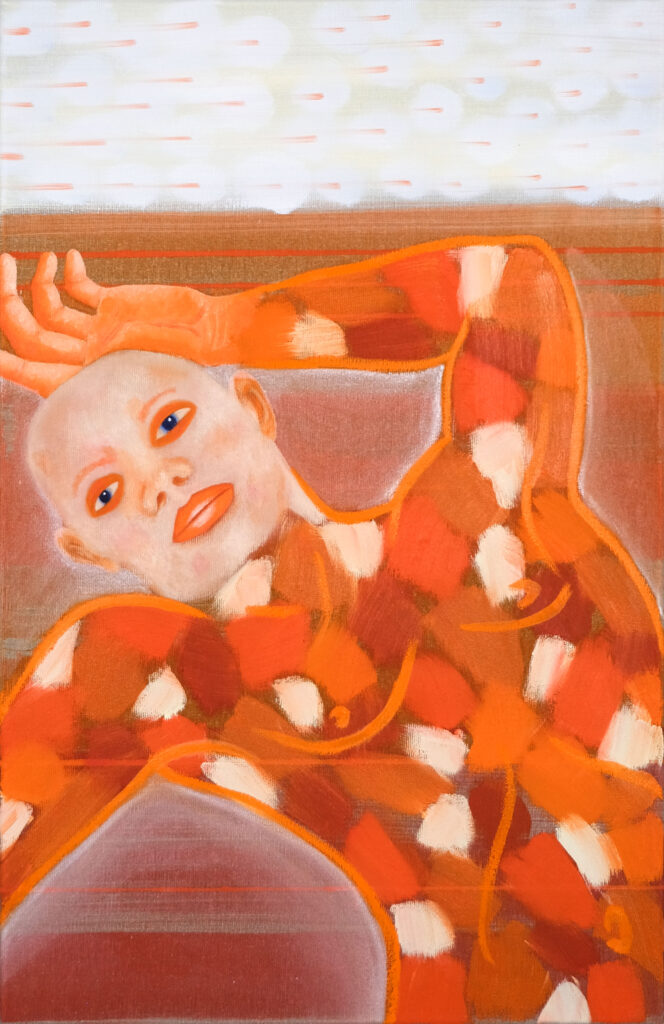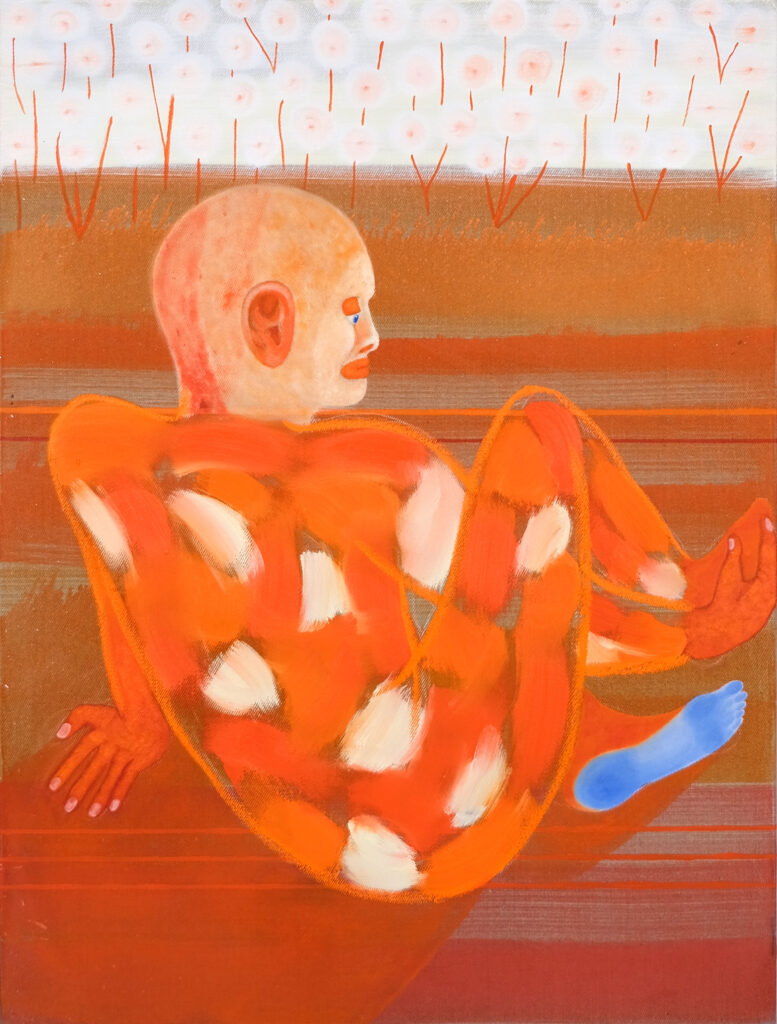Die daraus entstandene Arbeit „Im Feld“ und besteht aus neun großformatigen, monochromen Gemälden. Sie bildet ein Panorama aus fragmentarischen Szenen und Figuren – wartende, sitzende, liegende Körper, die eine Atmosphäre von Stillstand und Unsicherheit ausstrahlen. Die Bildsprache verweist auf Themen wie Leere, Lethargie und Perspektivlosigkeit, die für viele Menschen in den Transformationsjahren prägend waren.